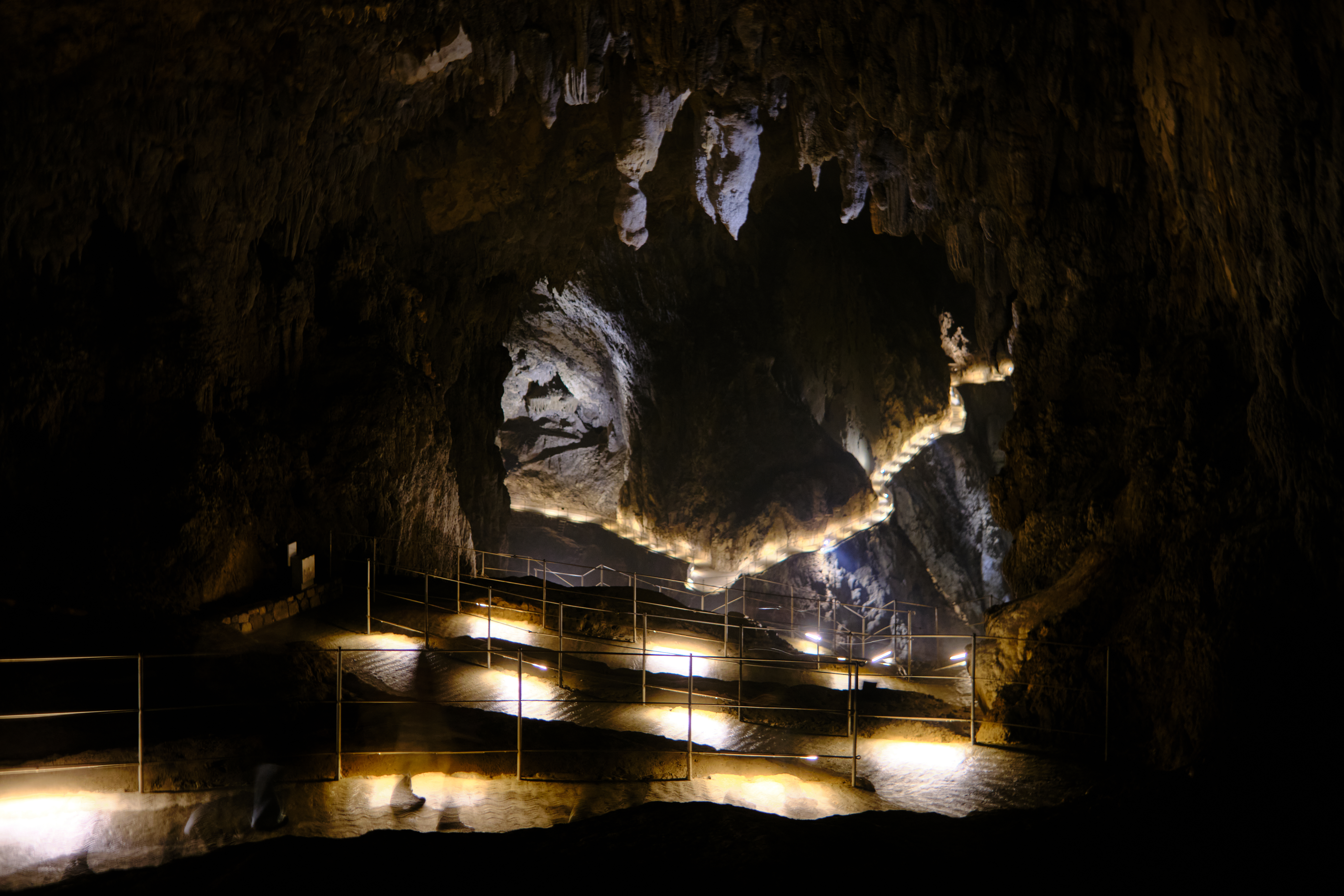 Cool air greeted us as we stepped into the cave. A narrow tunnel soon opened into vast chambers where subtle lighting revealed towering rock formations. Far below, the Reka River rumbled through the darkness, continuing its underground journey toward the Adriatic Sea.