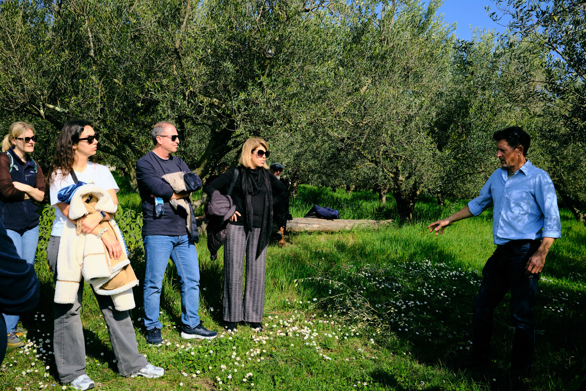 As we walked through the orchard, it became clear how the farm integrates soil-friendly management practices. Between the olive trees, the ground was covered with a diverse mix of grasses and flowering plants, protecting the soil from erosion while supporting biodiversity. A swale built along the slope slows down rainwater and allows it to infiltrate rather than run off. According to the owners, trees growing just below the swale, once among the weakest on the farm, are now healthier and more productive.