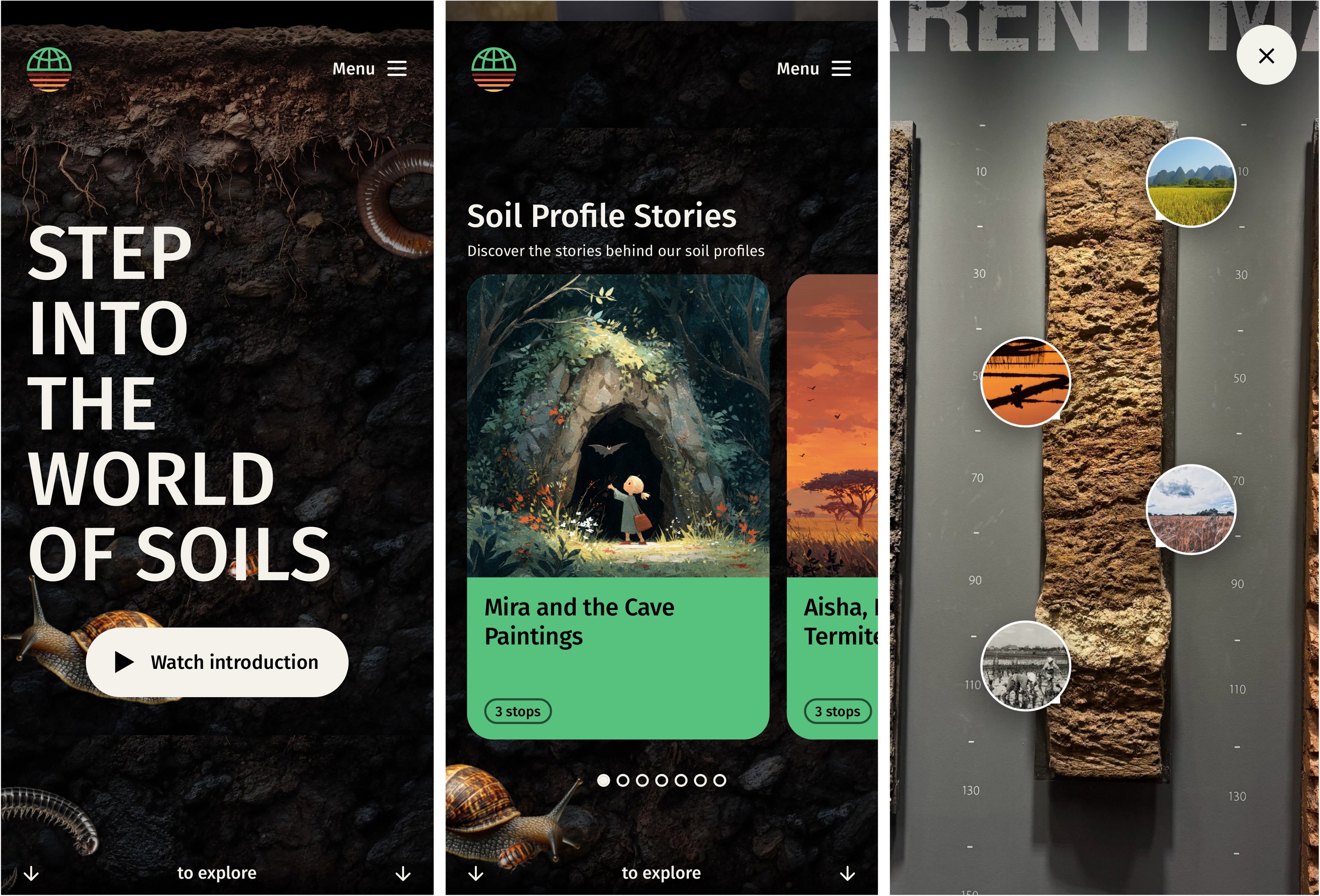 Screenshots of the World Soil Museum web-app and the AR functionality (right)