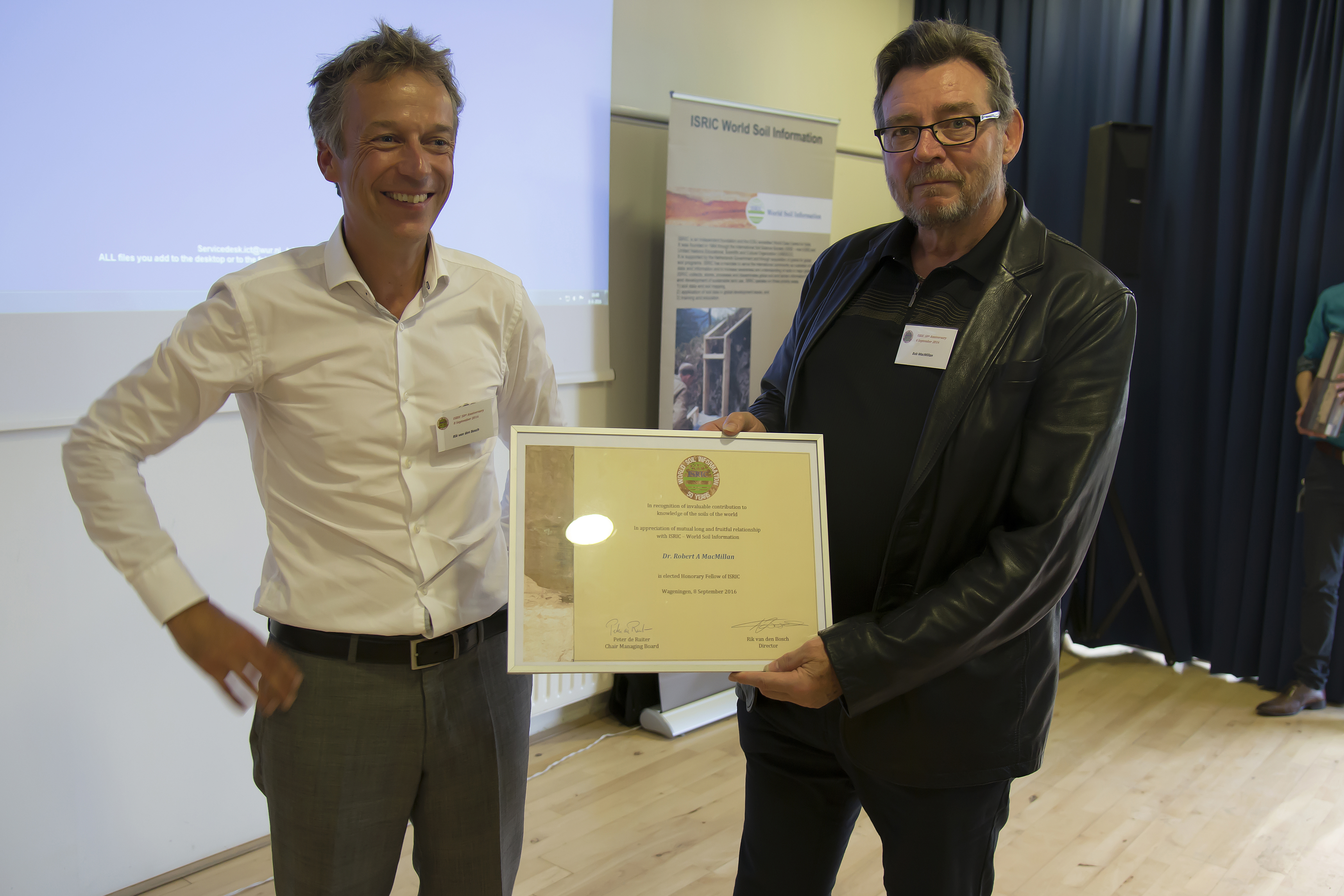 On 8 September 2016, ISRIC celebrated its 50th anniversary with an informal get-together with current and former colleagues, and friends of ISRIC. During the event em. prof. dr. JA (Seppe) Deckers and dr. RA (Bob) MacMillan have been appointed as Honorary Fellows. In their speeches, former director David Dent, Johan Bouma, and current director Rik van den Bosch addressed past, present and future aspects of ISRIC. During the event em. prof. dr. Seppe Deckers and dr. Bob MacMillan have been appointed as Honorary Fellows.