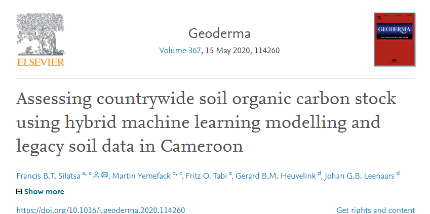New Geoderma paper on 'Assessing countrywide soil organic carbon stock using hybrid machine learning modelling and legacy soil data in Cameroon', by Francis B.T. Silatsaa, Martin Yemefack, Fritz O. Tabi , Gerard B.M. Heuvelink and Johan G.B. Leenaars. https://doi.org/10.1016/j.geoderma.2020.114260