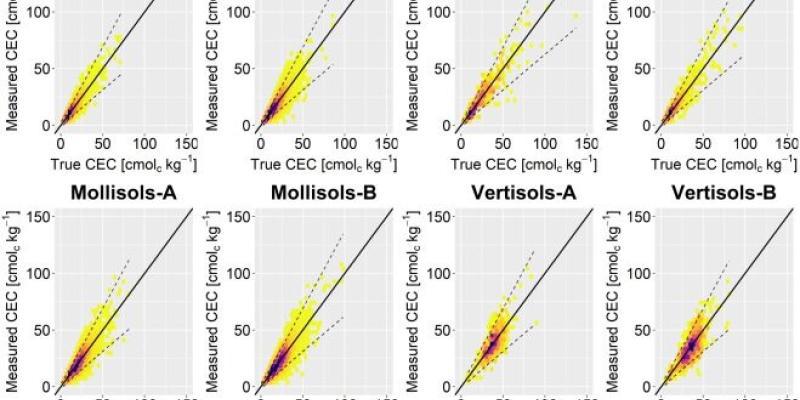 Scatter density plot of measured CEC values versus the ‘true’ CEC (with 1:1 line in black) A new open access paper titled "Effect of measurement error in wet chemistry soil data on the calibration and model performance of pedotransfer functions", with ISRIC colleague Cynthia van Leeuwen as main author, was recently published in Geoderma.
