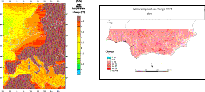 Influenced by the Gulf stream, the climate in western and central Europe has temperate characteristics, with mild summers and mild winters and a rather even rainfall distribution over the year. Going eastward there is a tendency towards a continental climate with warmer summers and colder winters. Southern Europe has a more Mediterranean climate characterised by warm, dry summers and cool, wet winters with high rainfall intensity. Besides the influence of the Gulf stream, the climate in Europe is determined essentially by the interactions among three pressure centres: the Icelandic Low, the Azores High, and Continental Highs, which predominate in winter, and lows, which generally are confined to summer months (IPCC, 1997). The European climate is highly variable from one place to another due to topographic features that have a significant influence on regional climate (plains, mountains, water bodies). HADRM3 – A2B SRES climate scenario (2071-2080)