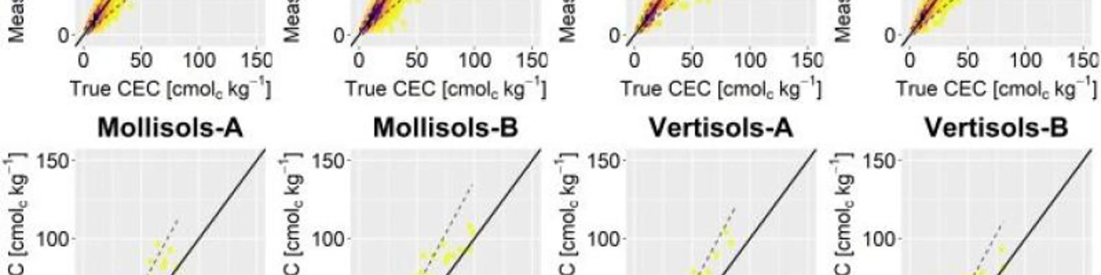 Scatter density plot of measured CEC values versus the ‘true’ CEC (with 1:1 line in black) A new open access paper titled "Effect of measurement error in wet chemistry soil data on the calibration and model performance of pedotransfer functions", with ISRIC colleague Cynthia van Leeuwen as main author, was recently published in Geoderma.